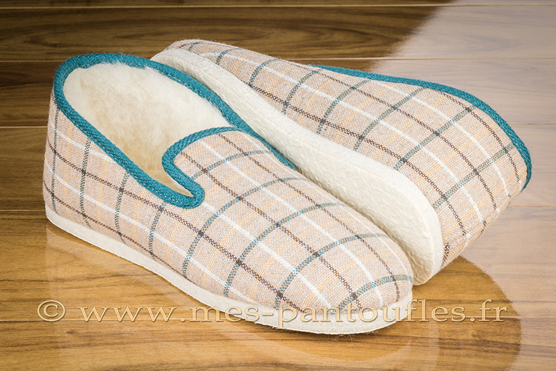 NouveauPantoufles charentaises semelles feutre écossais vert/beige